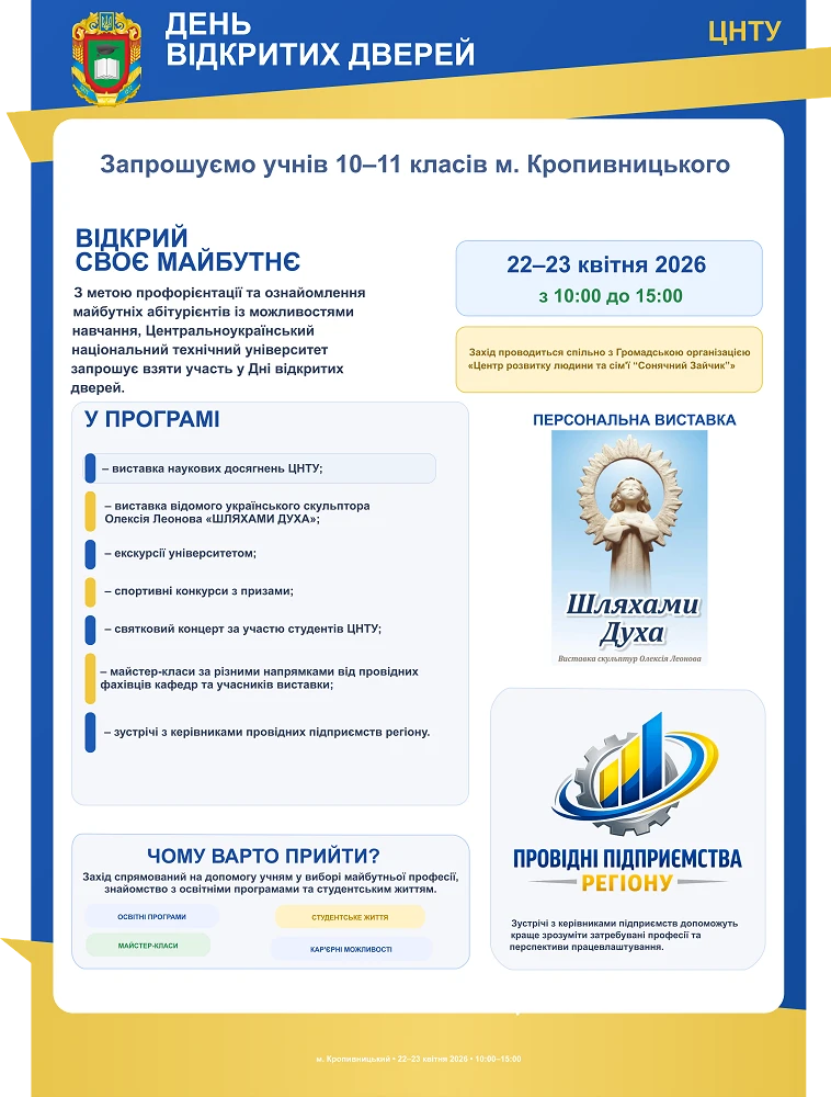 У Центральноукраїнському національному технічному університеті 10-11 жовтня відбувся профорієнтаційний захід «День відкритих дверей ЦНТУ» в межах регіональної програми Кіровоградської обласної військової адміністрації «Хочу тут вчитись».