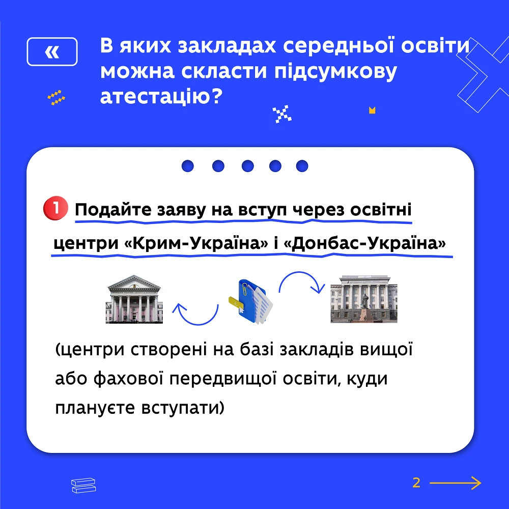 - Особисто, або дистанційно подайте заяву та заповніть освітню декларацію в освітній центр «Крим-Україна» та «Донбас-Україна», для участі у співбесіді для навчання на бюджеті за квотою-2 – з 1 червня до 10 липня, за контрактом – до 23 вересня 2024 року.